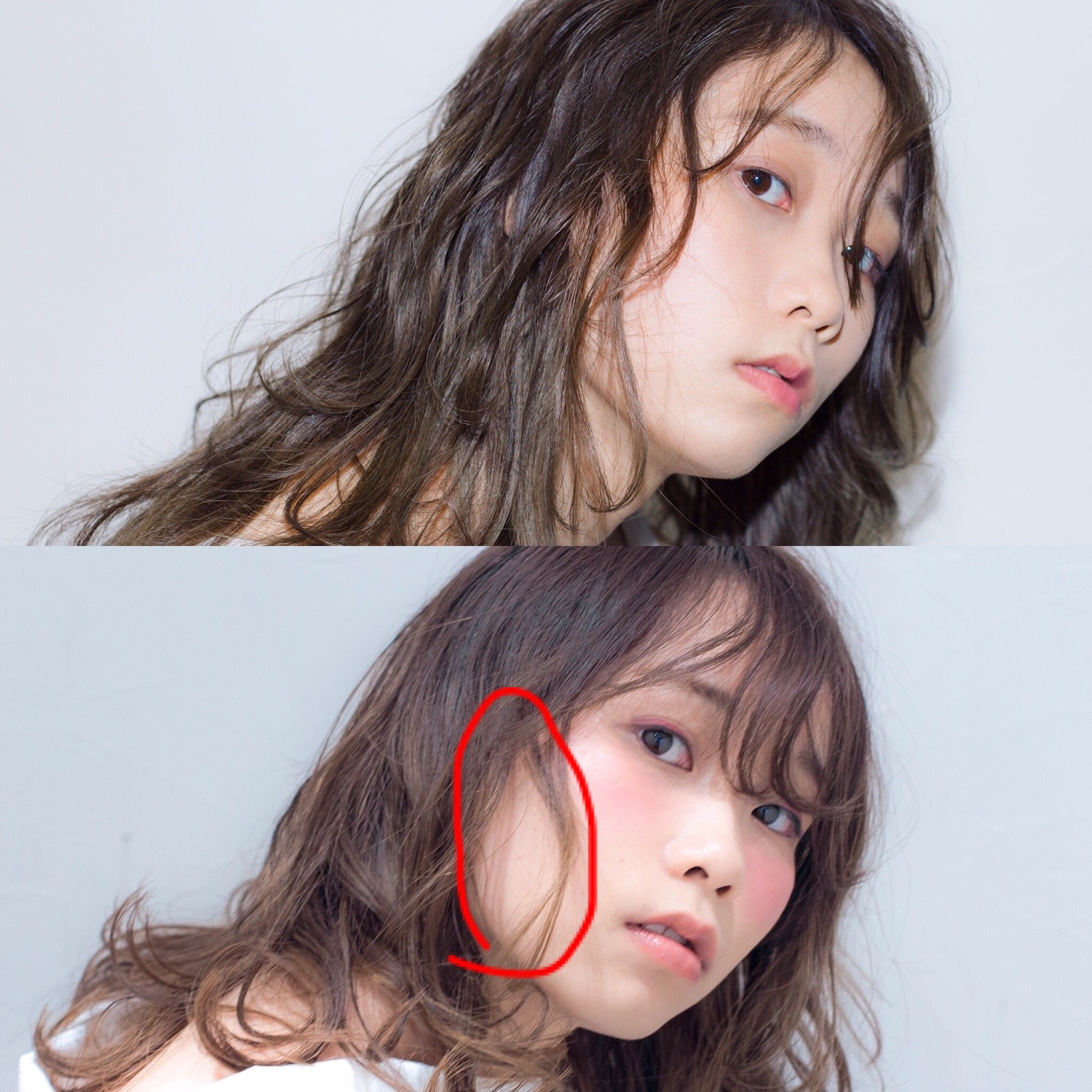髪の動きや隙間の違いを丸で囲ってみました表面の躍動感や柔らかさ、前髪の抜け感の違いがわかるかなと思います