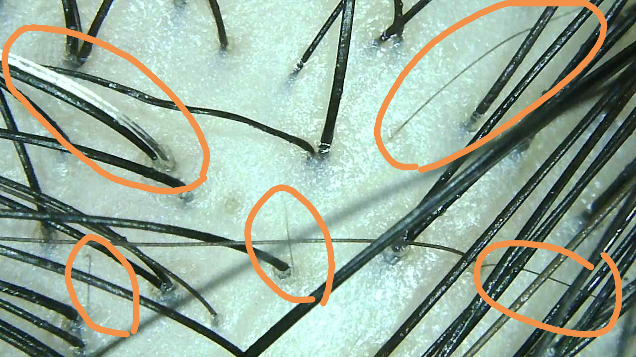 仕事終わりに来てくれたので頭皮の脂やヘルメットなどの圧迫で赤みは多少ありますが◯を付けている部分が短く新しい髪の毛が生えて来てました!3ヶ月前の画像を残して無かったので比較が出来ませんが友人も「最近ボリュームが出てきた!」と実感している様子でした(^-^) 3月前には無かった短い新しい髪の毛です♪